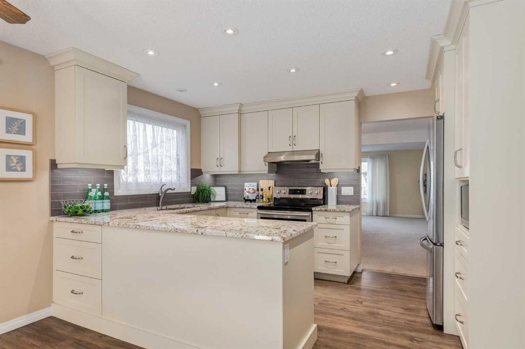 Welcome to this UPDATED and well-maintained OVERSIZED, fully finished WALK-OUT bungalow with kitchenette in the lower level, in the highly sought-after, family community of Hawkwood. This charming corner-lot home with double front attached garage offers 3 spacious bedrooms up, 3 full bathrooms, spacious south facing deck off the family room, over 2,900 Sq Ft of finished living space - perfect for family living and entertaining. You’ll love the spacious living and dining room, totally RENOVATED kitchen with an abundance of white cabinets, granite counters & stainless steel appliances. Adjacent to the kitchen is an expansive dining and family room featuring a gas fireplace - ideal for both everyday living and entertaining. Patio doors lead to the lovely south facing deck with newer vinyl covering (2020), with stairs to the backyard. Primary bedroom easily accommodates king-size furniture and features a bay window with bench, walk in closet and 4 piece ensuite bath. 2 additional bedrooms are both generously sized and 4 piece main bath completes the level. The fully developed walk-out basement includes a huge recreation room with cozy gas fireplace, 2nd kitchen, two rooms (windows are not egress size), 4 pc bath and patio doors to the backyard. An ideal space for guests or extended family. The backyard offers a large green space with mature landscaping, planter boxes with many perennials – a beautiful space for your summer enjoyment! You’ll appreciate all the updates completed in the home over the years: Hardwood floors in the bedrooms (2008) and luxury vinyl plank flooring in kitchen & family room (2016), new flooring in basement (2009), all main floor windows and both patio doors replaced (2011), new shingles (2018), high efficiency furnace (2010), front and back landscaping redone over the past 5 years. Enjoy this convenient location with easy access to transit and main traffic routes. Don’t miss out on this fantastic opportunity – book your viewing today! MLS®: A2279062 - Hawkwood Bungalow $729,900